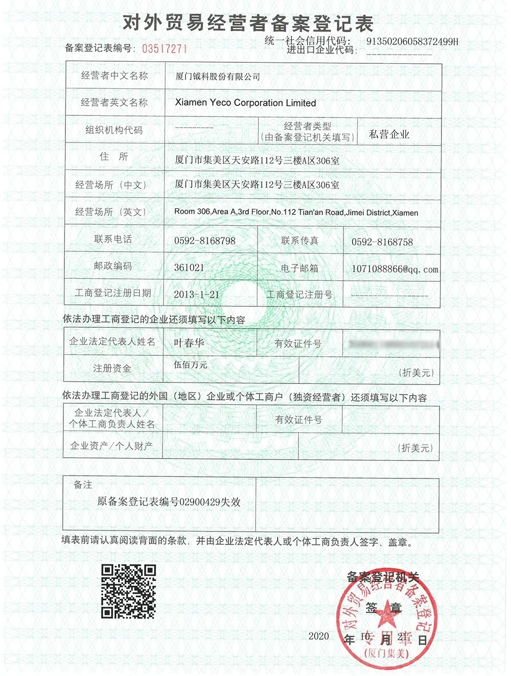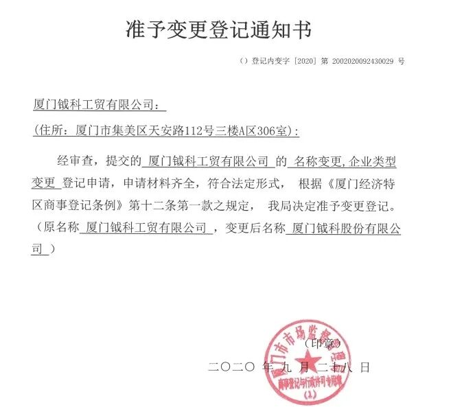 附圖:廈門市市場監督管理局審核通過并蓋章的《準予變更登記通知書》、《對外貿易經營者備案登記表》: